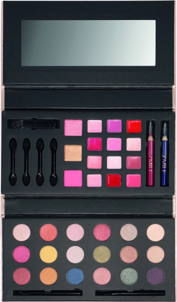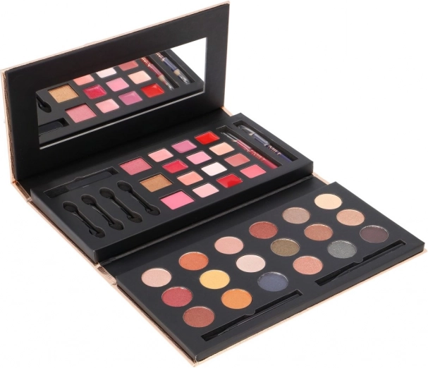 La elegante paleta desplegable Glam To Go con diseño compacto ofrece todo para un maquillaje completo en viaje o en casa: 18 sombras de ojos, 12 labiales en crema, colorete, polvo bronceador, lápiz de ojos y de contorno, aplicador y espejo integrado. Dermatológicamente testado y conforme a las estrictas normas de la UE.