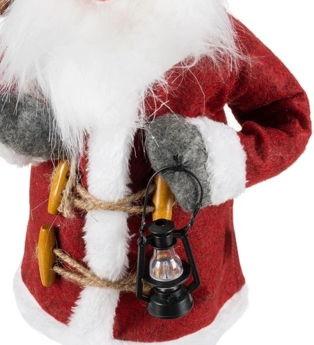 San Nicolás sostiene un farol decorativo y lleva a la espalda un saco con regalos. Estos detalles crean al instante un ambiente festivo y acogedor.