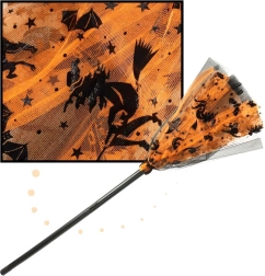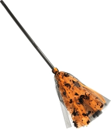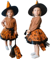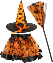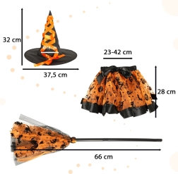 Todo lo que necesita una pequeña bruja: sombrero puntiagudo, falda tutú con volumen y una escoba con diseño a juego.
