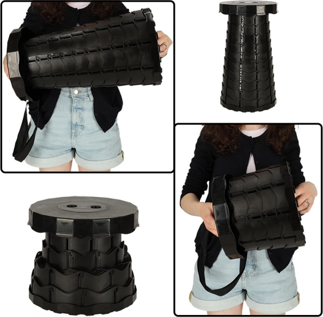 Gracias al plástico resistente, el taburete es estable y fiable. Plegado ocupa un espacio mínimo y, con la correa ajustable, puedes guardarlo fácilmente en la mochila, el bolso o el coche.