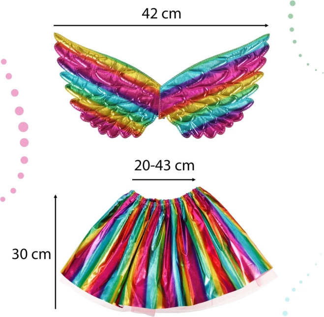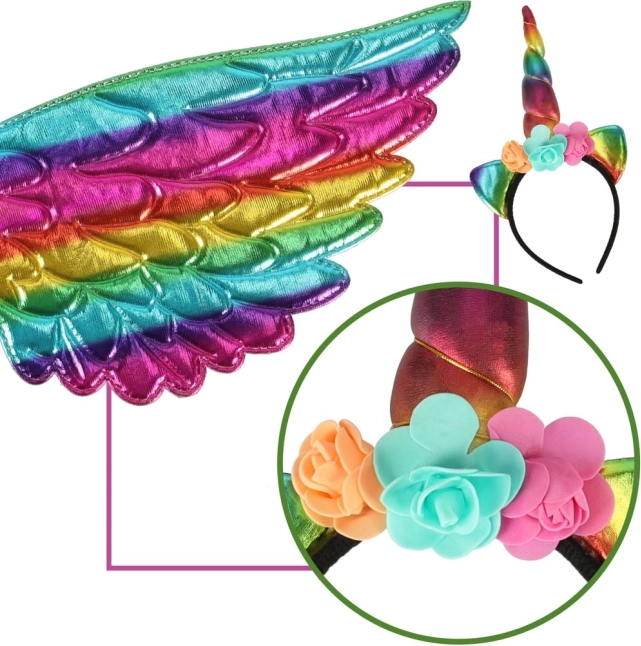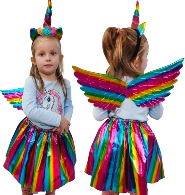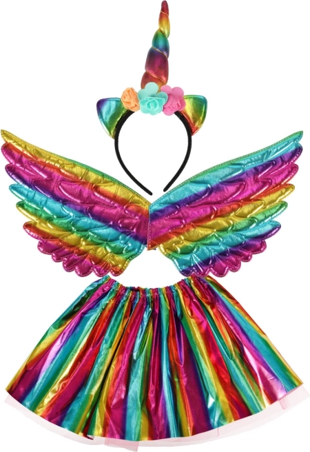 En el paquete encontrarás todo lo necesario: alas arcoíris, diadema con cuerno y falda, ideal para cualquier celebración.