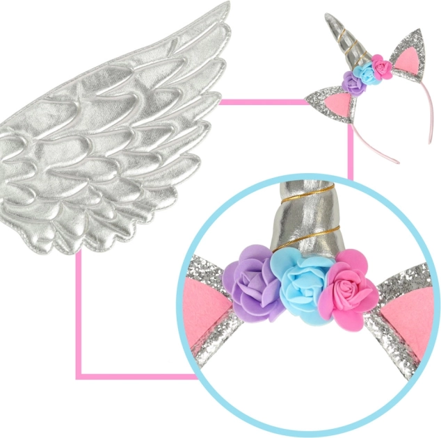 Este hermoso disfraz te permitirá transformar a tu hijo en un unicornio único. Consta de una falda plateada, elegantes alas y una diadema cuidadosamente elaborada con florecillas. Ideal para cualquier ocasión en la que el niño pueda disfrutar de un juego de fantasía.