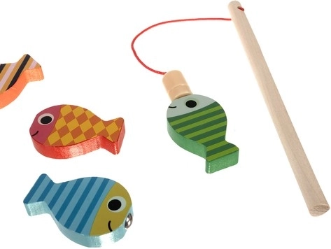 Los pececitos de colores con imanes y la caña de madera desarrollan de forma divertida la precisión del movimiento y la concentración. Los niños pescan, clasifican por colores y cuentan sus capturas.