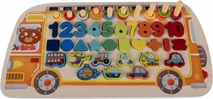 - base de madera, caña para pesca magnética, varillas, 10 pececitos con imán, 3 signos matemáticos, 10 números, 7 formas geométricas, 55 anillas, 9 piezas de rompecabezas de vehículos