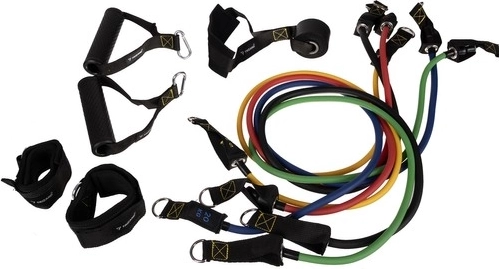 - 5 bandas de resistencia, 2 asas, 2 correas para tobillos, 1 ancla para puerta, bolsa de transporte