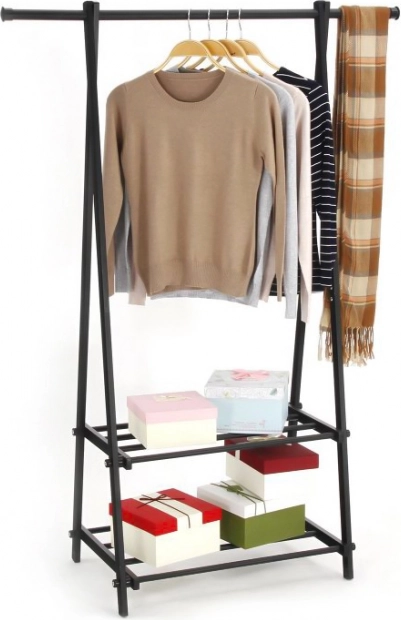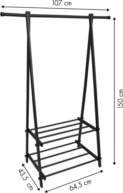 Este perchero compacto y ligero ayuda a mantener en orden la ropa y los accesorios. Su diseño minimalista encaja fácilmente en interiores modernos y ofrece espacio para abrigos, camisas y chaquetas, mientras que los dos estantes alojan zapatos, cajas o bolsos.