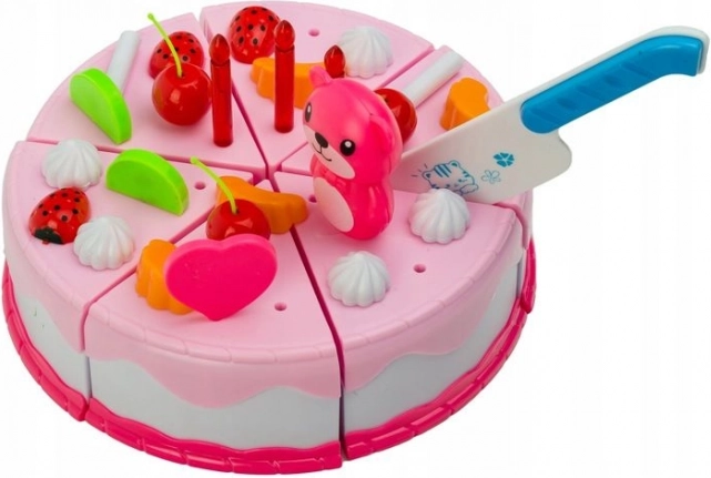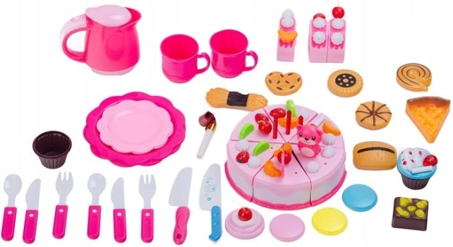 La tarta y los postres están divididos en porciones unidas con velcro. Los niños pueden “cortarlas” fácilmente con el cuchillo incluido y volver a unirlas: seguro y divertido.