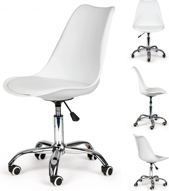 La elegante silla de oficina giratoria ModernHome combina altura ajustable con pistón de gas, respaldo alto y suave cojín blanco de piel ecológica para ofrecer comodidad durante todo el día. La estable base cromada con ruedas de goma garantiza un movimiento fluido y protege el suelo: ideal para oficinas modernas y despachos en casa.