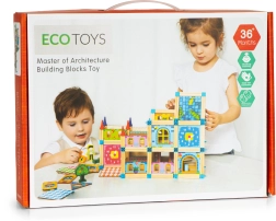 Juego de construcción de madera de ECOTOYS desarrolla la imaginación y la destreza de los niños con 128 bloques coloridos y motivos de personajes, coches y árboles.