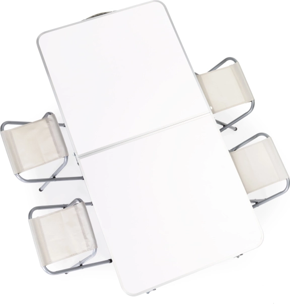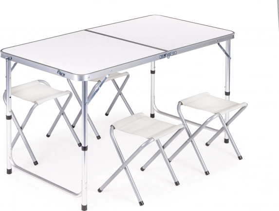 Mesa plegable ligera y cuatro taburetes resistentes con estructura de acero. Ideal para acampadas, picnics, festivales y el jardín.