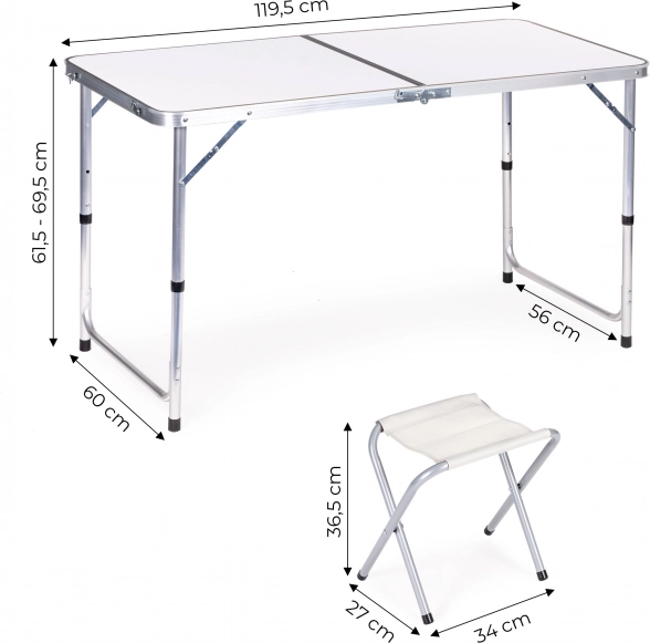 Juego práctico para viajar: mesa de camping plegable con cuatro taburetes de MultiGarden. Ofrece altura ajustable, bloqueo de seguridad contra plegado accidental y despliegue rápido. Gracias a sus dimensiones compactas, se pliega en un maletín con asa para facilitar el transporte. Ideal para acampadas, picnics y escapadas de fin de semana.