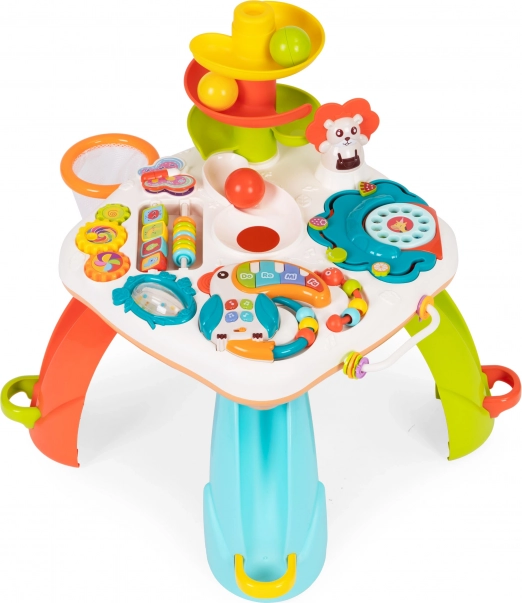 La mesa educativa no solo es una excelente forma de pasar el tiempo, sino también de apoyar el desarrollo del niño. El juguete incluye muchos elementos manipulativos, como el tucán musical, un sonajero, cuentas de colores, juguetes giratorios y un dial telefónico, que ayudan a desarrollar la motricidad fina y la coordinación.