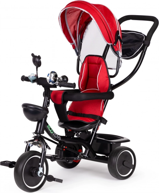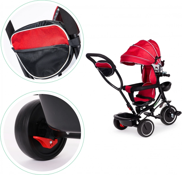 El triciclo está equipado con un respaldo acolchado, cinturones de seguridad y una capota abatible para proteger contra el sol y la lluvia. Está diseñado especialmente para los más pequeños, para que puedan sentarse con mayor facilidad.