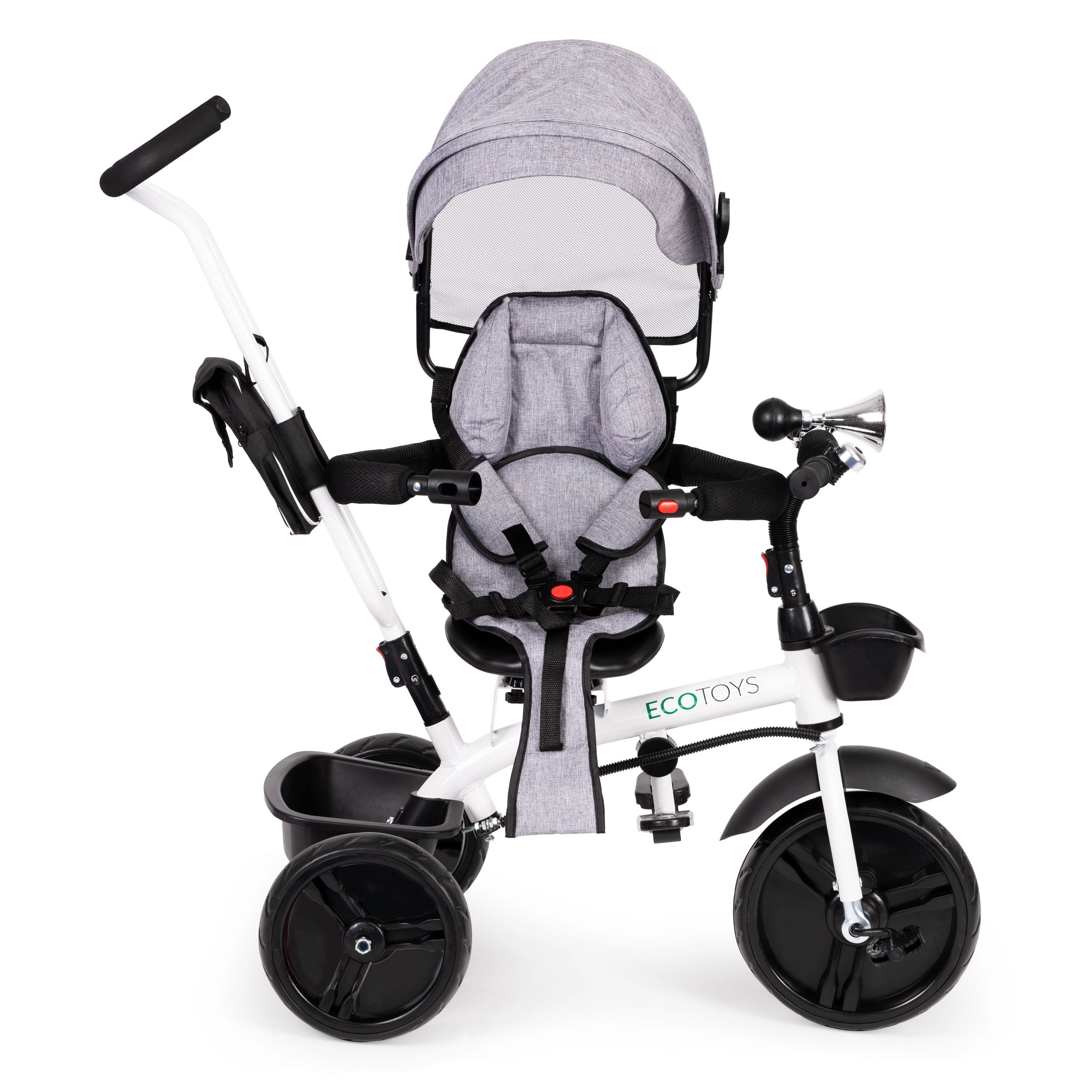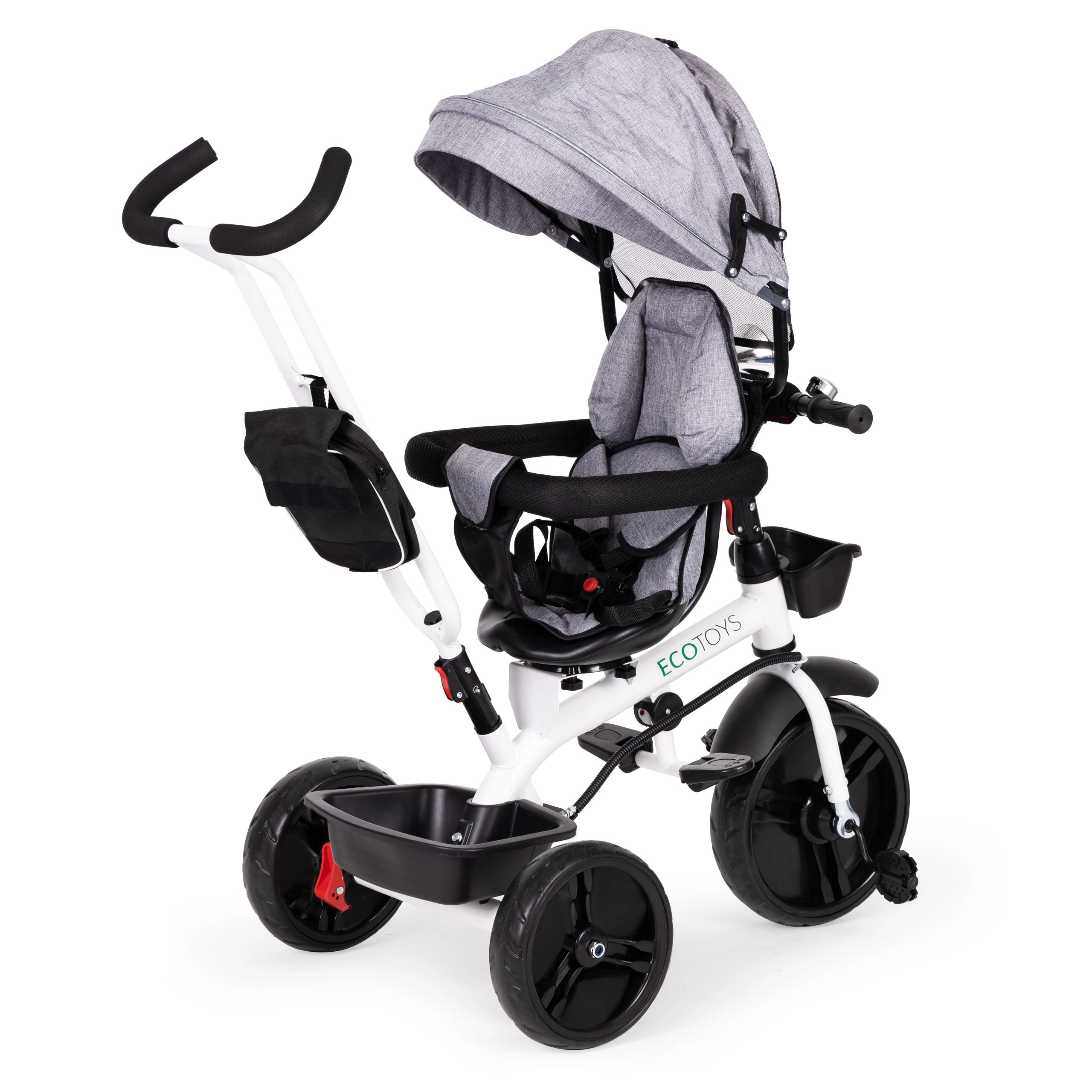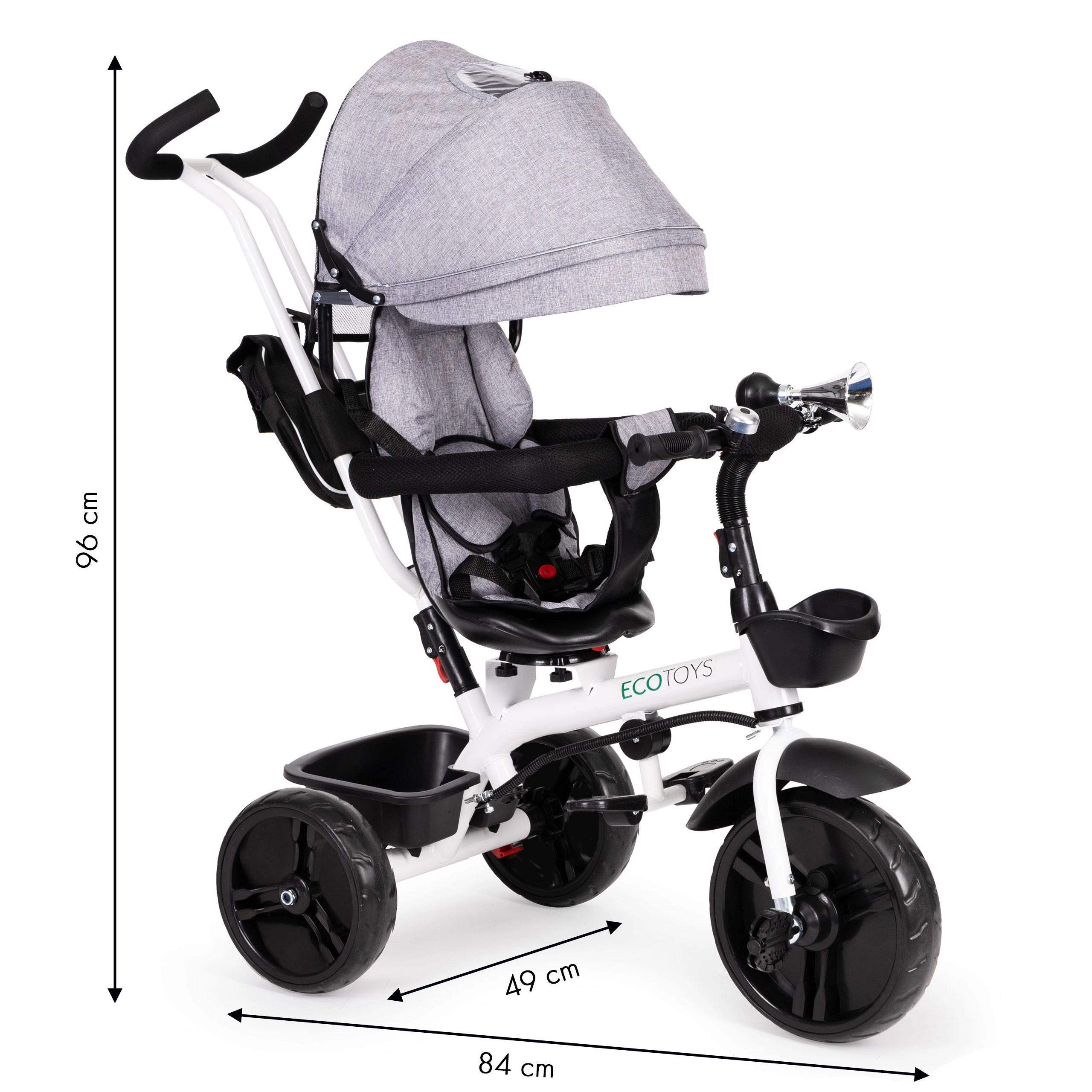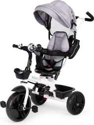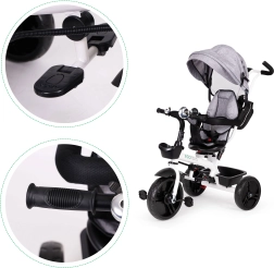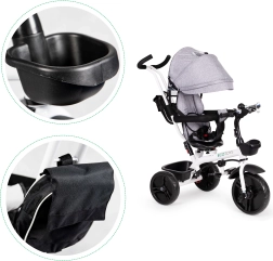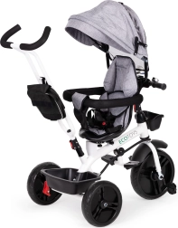 Este triciclo multifuncional crece con tu hijo: desde el modo con guía parental hasta la conducción independiente. El asiento giratorio 360° permite orientarlo hacia el adulto para un mejor contacto o en el sentido de la marcha para los pequeños exploradores curiosos. El asiento acolchado, el arnés de seguridad de 5 puntos y la barra protectora ofrecen confianza, mientras que la capota ajustable protege del sol y de lloviznas ligeras.