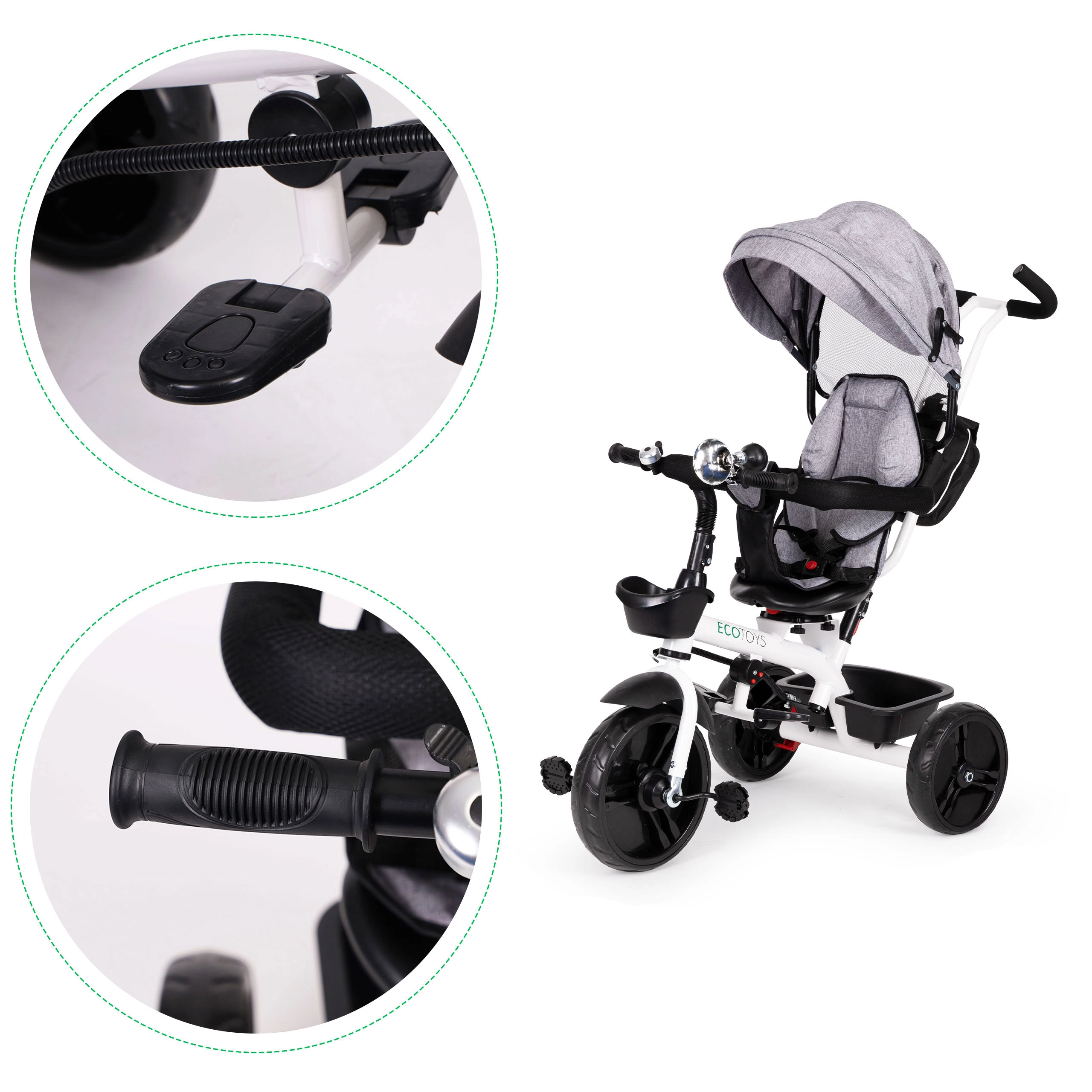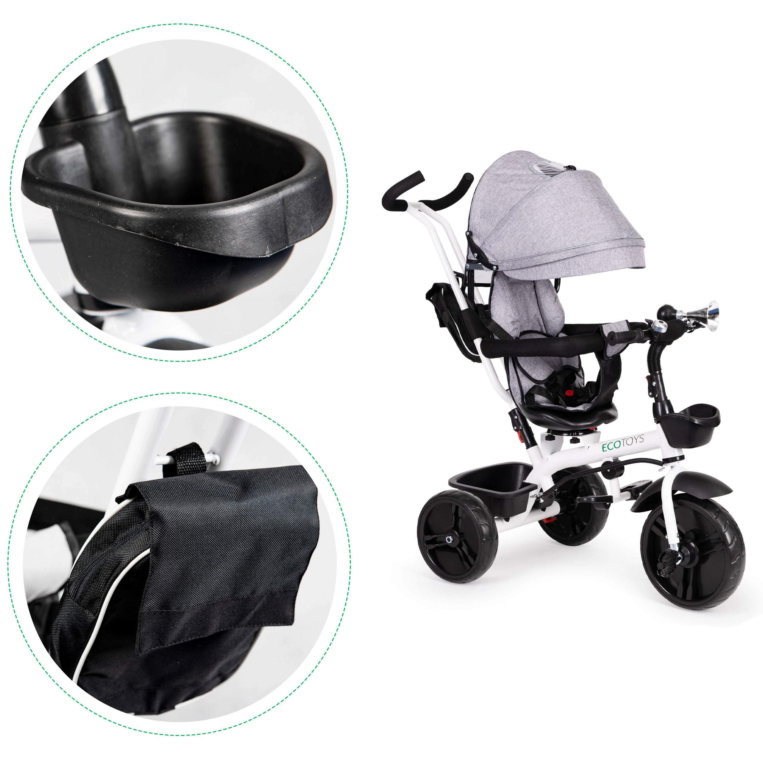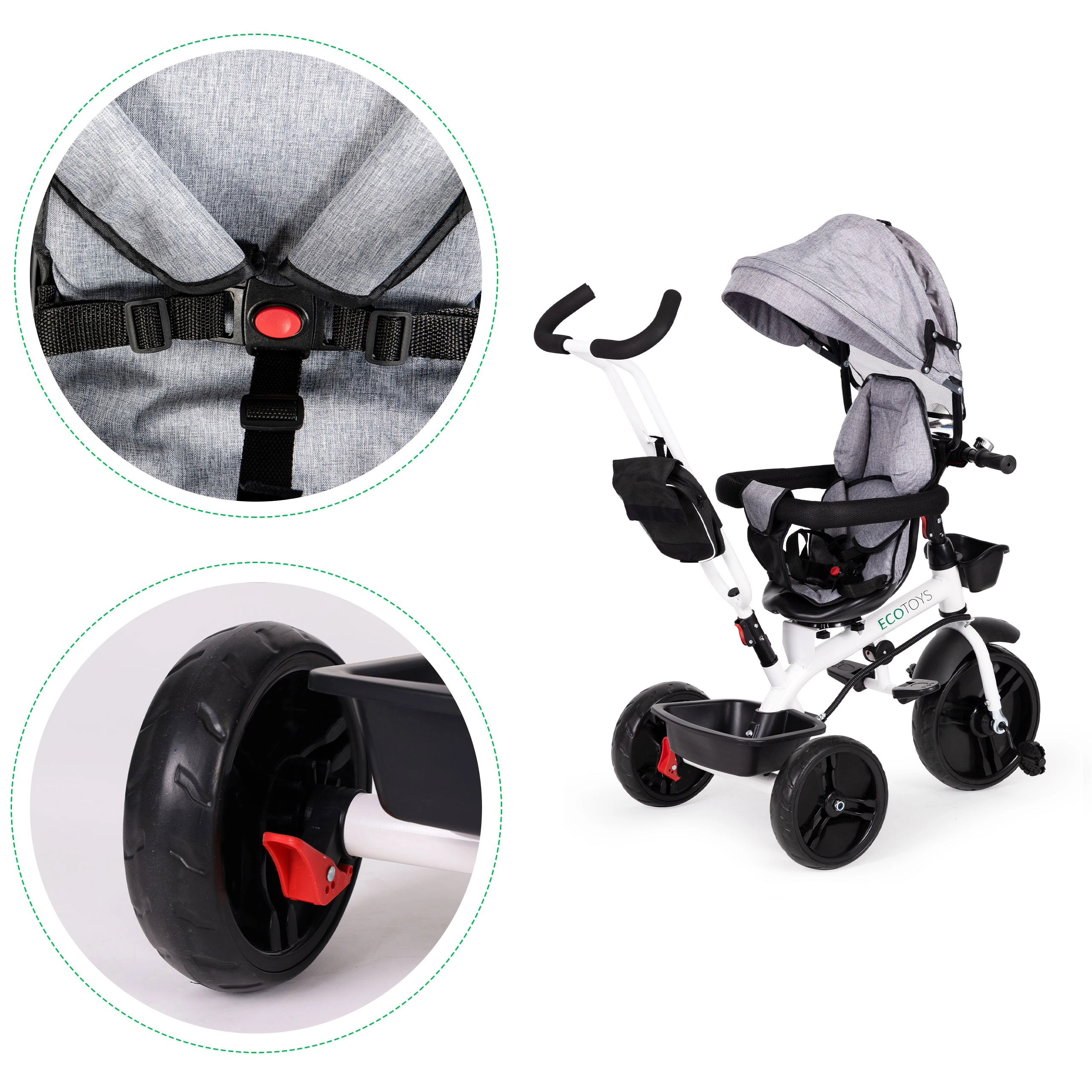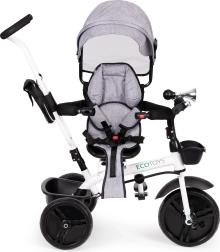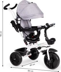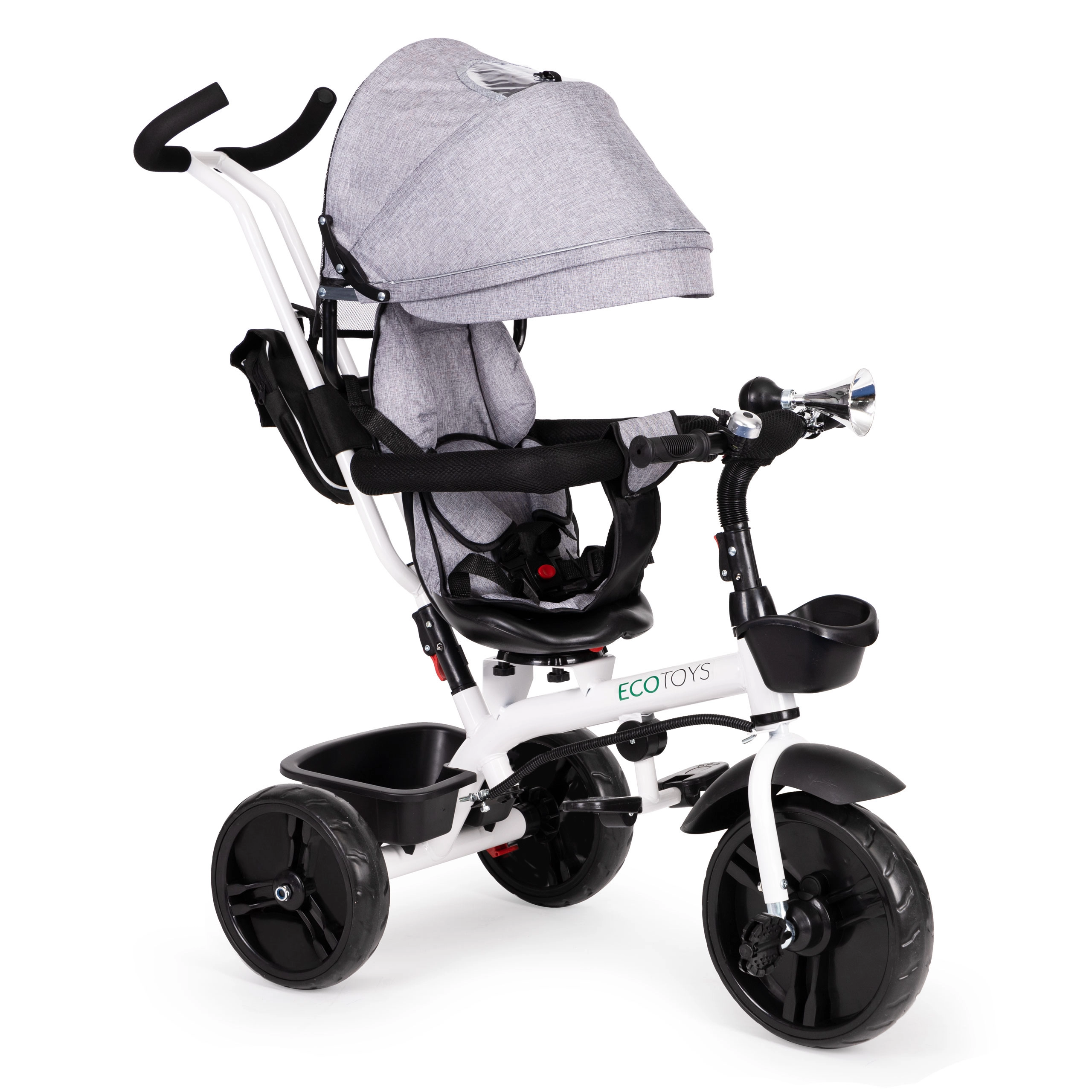 Este triciclo multifuncional crece con tu hijo: desde el modo con guía parental hasta la conducción independiente. El asiento giratorio 360° permite orientarlo hacia el adulto para un mejor contacto o en el sentido de la marcha para los pequeños exploradores curiosos. El asiento acolchado, el arnés de seguridad de 5 puntos y la barra protectora ofrecen confianza, mientras que la capota ajustable protege del sol y de lloviznas ligeras.
