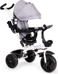 Las ruedas EVA son silenciosas y resistentes, no necesitan inflado. Los reposapiés plegables, la capota ajustable, las cestas y la bolsita aumentan la comodidad del niño y de los padres.