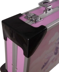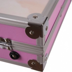 El maletín rosa con bordes, esquinas y cierres metálicos mantiene el orden y protege los materiales durante el transporte en casa y de viaje.