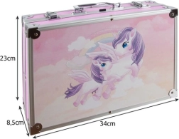 Descubre el completo set de pintura en un resistente maletín rosa con motivo de unicornios, ideal para niños y creadores principiantes. Dentro encontrarás todo para dibujar, colorear y pintar: rotuladores, lápices de colores, pasteles al óleo, acuarelas y pinturas acrílicas, además de prácticos accesorios. Gracias al organizador con compartimentos, los materiales permanecen ordenados y seguros. Las esquinas y cierres metálicos protegen el contenido durante el transporte.