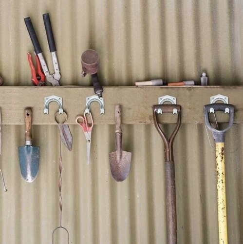 Percheros metálicos altamente resistentes diseñados para la organización de herramientas en tu taller o jardín. Gracias a su resistencia y a su fabricación de calidad, manejan incluso herramientas pesadas.