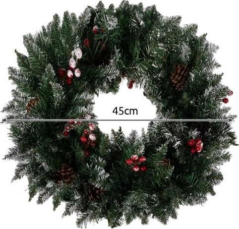 Gracias a la nieve artificial y a las piñas, mantiene un aspecto fresco durante mucho tiempo y no requiere ningún mantenimiento. La corona tiene ramitas flexibles que se pueden ajustar según tus preferencias. Es resistente a las inclemencias del tiempo y puede utilizarse tanto en interiores como en exteriores.