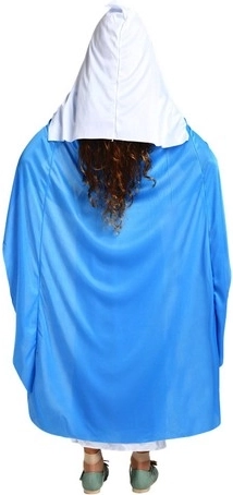 Elegante disfraz de la Virgen María para niños que incluye un vestido blanco largo con capa azul incorporada, cinturón a juego y cubrecabezas blanco. La alta calidad del material garantiza que el disfraz sea suave, ligero y cómodo, no limita el movimiento y es perfecto para pastorelas, actuaciones navideñas, eventos religiosos y fiestas de disfraces. Su aspecto auténtico y diseño atemporal ayudan a los niños a meterse fácilmente en el papel.