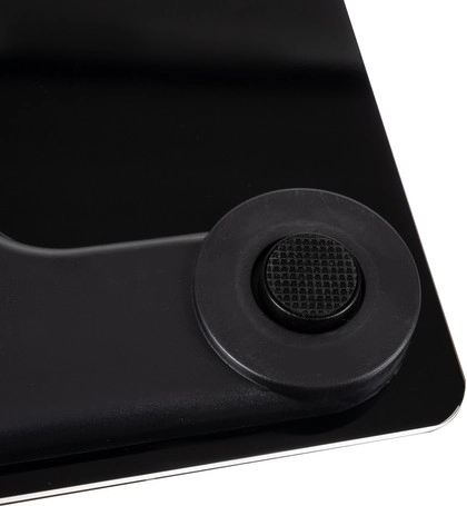 Plataforma negra de 0,3 cm de vidrio templado que soporta hasta 180 kg y ofrece un uso estable y seguro en el baño.