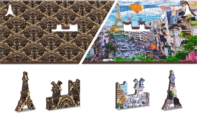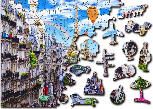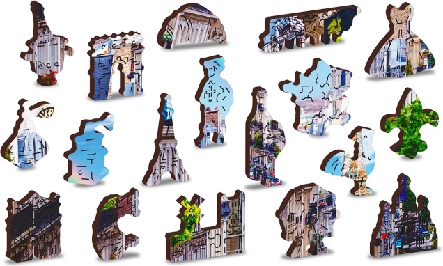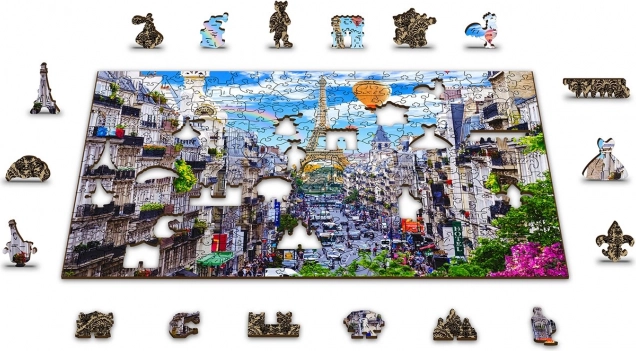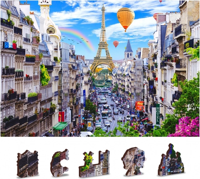 Los rompecabezas de madera París bulliciosa de WOODEN CITY son únicos por su construcción de doble cara y sus piezas con formas especiales que dan vida a toda la escena durante el montaje. El montaje es más exigente debido a las piezas de formas variadas, pero también más divertido. Representa un desafío incluso para aficionados experimentados.