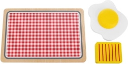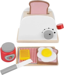 Set de desayuno completo para pequeños chefs: tostadora de madera, 2 rebanadas de tostada, huevo frito, queso, cuchillo de madera, tarro de mermelada y bandeja de servicio. Los niños pueden preparar un desayuno realista, imitar a los adultos y descubrir formas y colores. Los materiales naturales son duraderos y seguros para el juego diario.