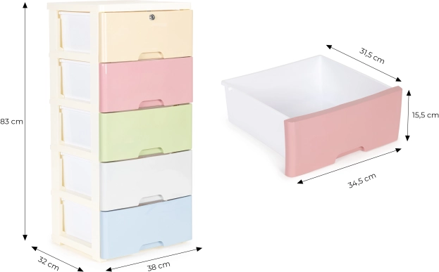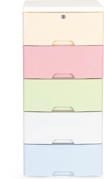 Práctico organizador móvil con 5 cajones extraíbles, ideal para el dormitorio infantil y el baño. Ofrece una sólida estructura de plástico, topes de seguridad en los cajones para evitar que se salgan y patas con ruedas para un traslado sencillo. El cajón superior dispone de cerradura con llave y el marco blanco con cajones de colores aporta al interior un aspecto moderno y ordenado.