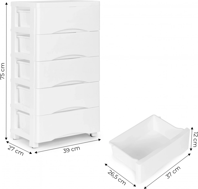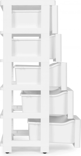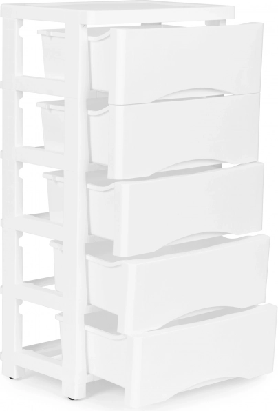 Cinco cajones extraíbles con tiradores ergonómicos mantienen cosméticos, juguetes y pequeños objetos bien organizados en un solo lugar. Ideal para el baño y la habitación infantil.