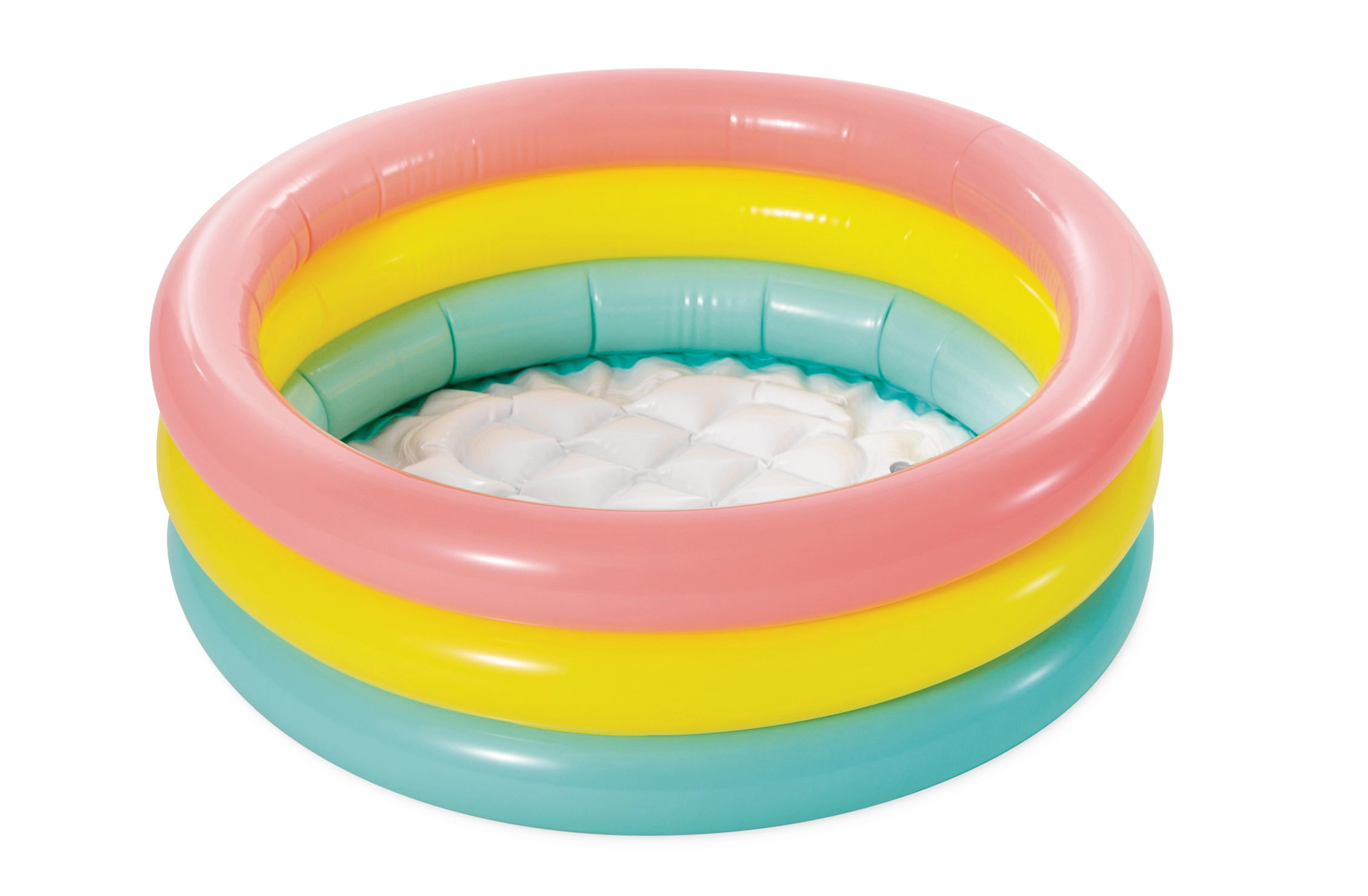 Brinda a tus hijos diversión bajo el sol con esta piscina inflable, ideal para juegos acuáticos al aire libre. Está fabricada en vinilo resistente y equipada con tres anillos en colores alegres. Gracias a su fondo inflable blando, es cómoda y segura para los niños, que adorarán chapotear en el agua.