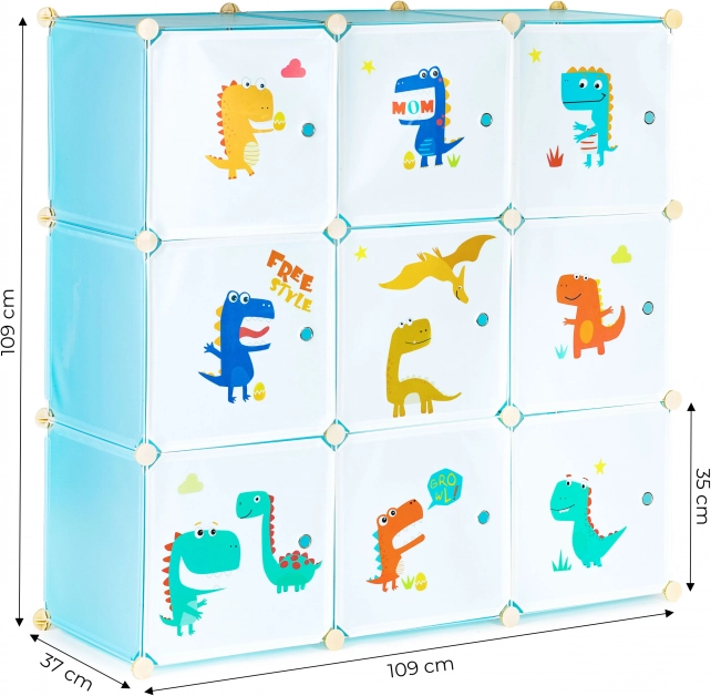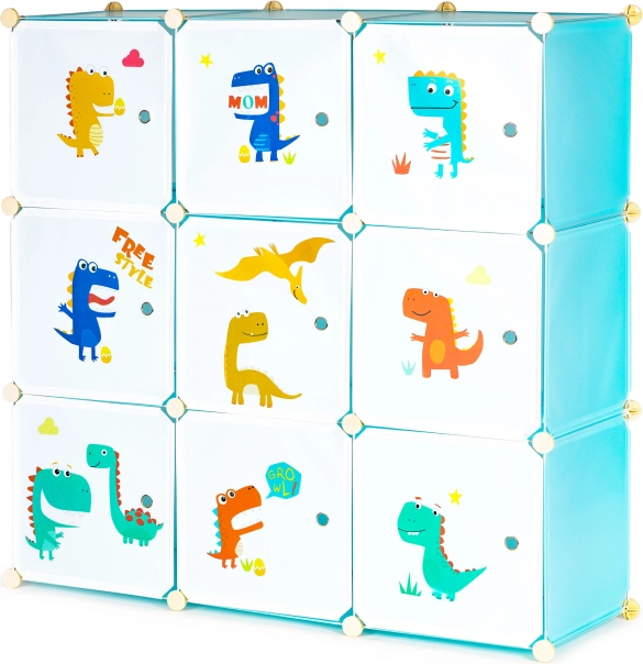 Este armario modular para habitación infantil combina un diseño divertido con funcionalidad diaria. Nueve cubos cerrables con coloridas impresiones de dinosaurios organizan el espacio de almacenamiento y motivan a los niños a mantener el orden por sí mismos. Gracias a los duraderos paneles de polipropileno y al marco metálico reforzado, el armario es ligero pero estable.