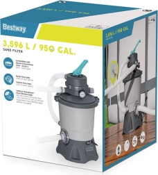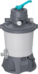 Gracias a su capacidad de 3596 l/h, la bomba es ideal para piscinas con un volumen de 1 100 a 18 100 litros. Para su funcionamiento requiere carga de arena (arena de sílice n.º 20, granulometría 0,45-0,85 mm, aproximadamente 8,5 kg) o bolas filtrantes de alto rendimiento Polysphere™ con un peso aproximado de 240 g.