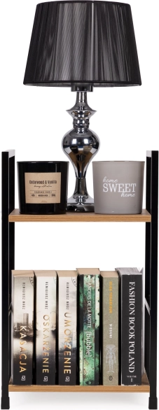 Aporta un estilo industrial puro a tu interior. Esta estantería minimalista con una altura de 48,5 cm y dos estantes de 23,5 × 29 cm ofrece espacio para libros, decoraciones, plantas e incluso una lámpara de noche. El metal con recubrimiento en polvo combinado con estantes de MDF con acabado madera garantiza durabilidad y un aspecto atemporal.