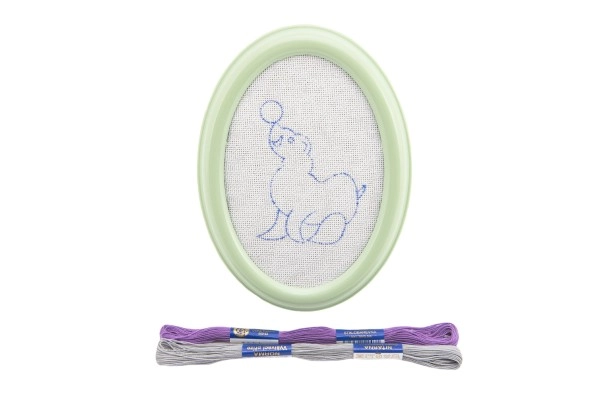 - Marco de plástico con tela tensada y diseño preimpreso, dos plantillas adicionales para bordar, hilos de algodón