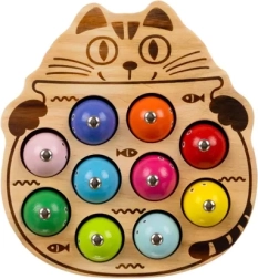 El paquete incluye una base de madera con forma de gatito, 10 peces magnéticos y 2 cañas magnéticas.