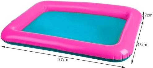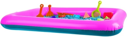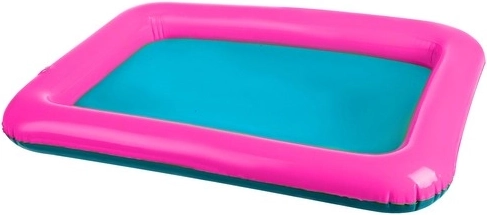 La práctica bandeja inflable mantiene la arena y los juguetes juntos. Se infla, desinfla y guarda fácilmente: ideal para jugar en interiores.