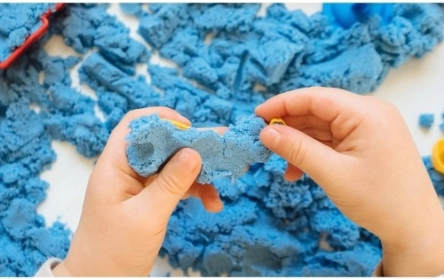 La arena cinética es extremadamente plástica, mantiene muy bien la forma y fomenta el desarrollo de la motricidad fina y la imaginación. No se pega a las manos y se limpia fácilmente.