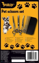 Juego completo para cortar el pelaje de tu perro en un práctico estuche. Hojas afiladas de acero inoxidable, puntas redondeadas seguras, mangos ergonómicos antideslizantes y amplios accesorios (tijeras rectas, de entresacar y curvas, peine metálico, pinzas, paño de limpieza y llave de ajuste) garantizan un grooming preciso y delicado en casa y en el salón.