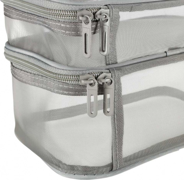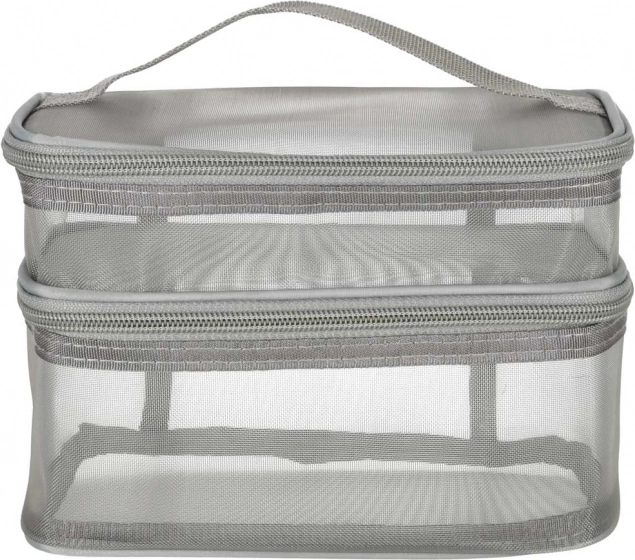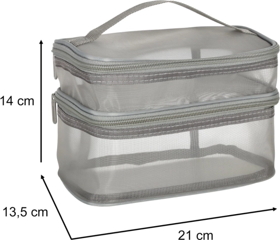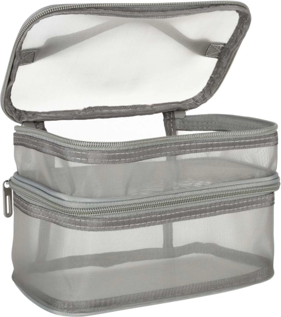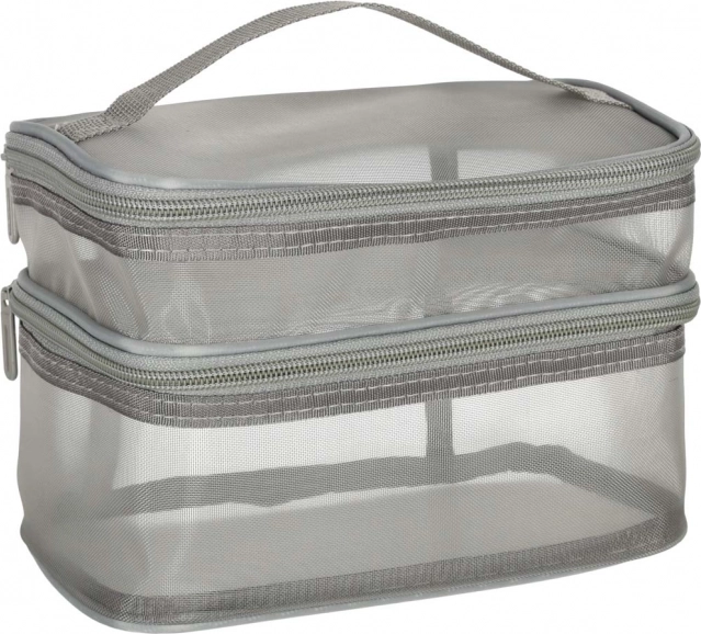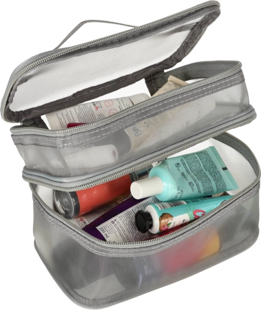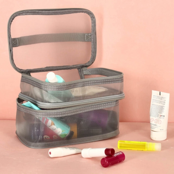 Este práctico neceser es un accesorio imprescindible para cualquier viaje. Cuenta con un diseño de dos compartimentos que permite una fácil organización de cosméticos y otros objetos personales. Fabricado con material de malla, que facilita localizar los productos guardados.