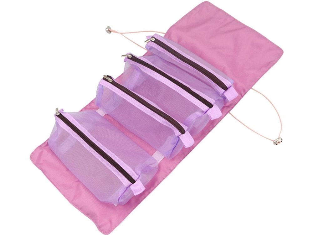 Se acabó el caos en el neceser. Este organizador cosmético enrollable 4 en 1 ofrece cuatro bolsillos transparentes con cremallera que, gracias al velcro, se pueden extraer y reorganizar según tus necesidades. Una vez plegado, se sujeta con bandas elásticas y queda bien compacto.