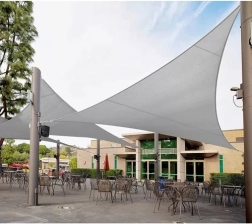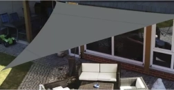 La forma triangular de 4 × 4 × 4 m crea una sombra agradable sobre la zona de estar en la terraza o el jardín. El material reduce el sobrecalentamiento y permite la circulación del aire.