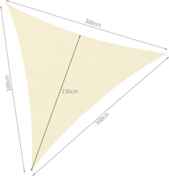 Práctico toldo vela triangular de 3 × 3 × 3 m en elegante color beige que ofrece sombra fiable y protección contra los rayos UV. Está fabricado en poliéster resistente de 120 g/m², es impermeable, de secado rápido y permite una libre circulación del aire. Gracias a los anillos de acero inoxidable y a las cuerdas incluidas, se fija fácilmente en el jardín, la terraza, el balcón o en el camping.