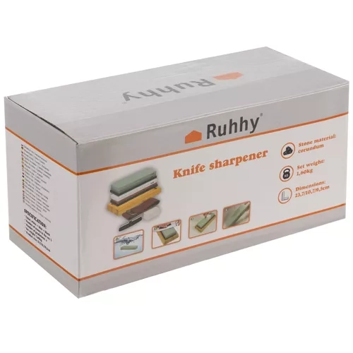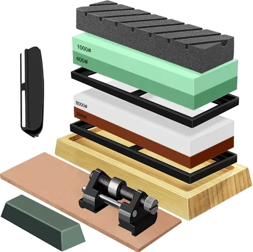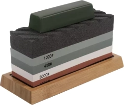 Juego completo de piedras de afilar al agua RUHHY para un afilado preciso de cuchillos y herramientas. Incluye 4 granulometrías 400/1000/3000/8000, piedra niveladora, guías y correa de cuero para pulido. Gracias a la base de bambú estable y a las alfombrillas antideslizantes, el afilado es seguro y cómodo. Ideal para cuchillos de cocina y de exterior, formones y tijeras: para restaurar el filo rápidamente, acabado final suave y larga vida útil de las hojas.