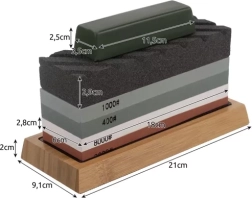 - 4 piedras de afilar (400/1000/3000/8000), 2 alfombrillas de goma, base de bambú antideslizante, correa y base de cuero para pulido, pasta de pulir, guía para formones/cuchillos, guía para el filo, piedra niveladora, caja a color, caja de transporte
