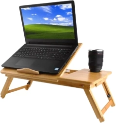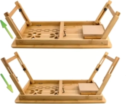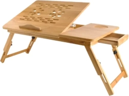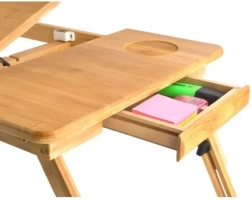 La estructura estable de bambú natural se complementa con un tope antideslizante para inclinación, un cajón integrado para lápices, auriculares o pendrive y también un portavasos en variantes seleccionadas. Las patas plegables facilitan el transporte y el almacenamiento. Una gran solución para la cama, el sofá, e incluso para el tren, autobús o avión.
