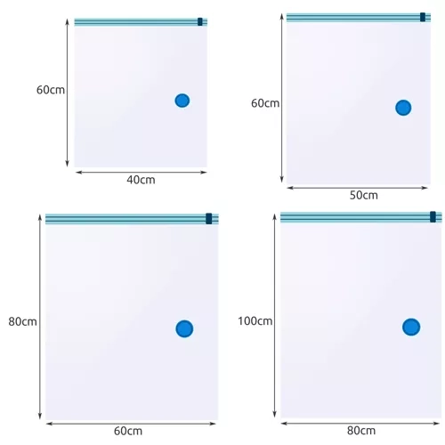 Las bolsas están fabricadas con una resistente combinación de PA + HDPE con sellado de silicona, por lo que soportan bien el uso repetido. El diseño transparente con cremallera azul facilita la rápida identificación del contenido y un almacenamiento ordenado.