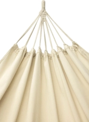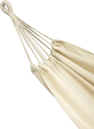 Estructura resistente: Gracias al uso de algodón y poliéster de alta calidad, la hamaca es extremadamente duradera y soporta hasta 120 kg. Plegada ocupa poco espacio y se guarda fácilmente con la funda incluida.