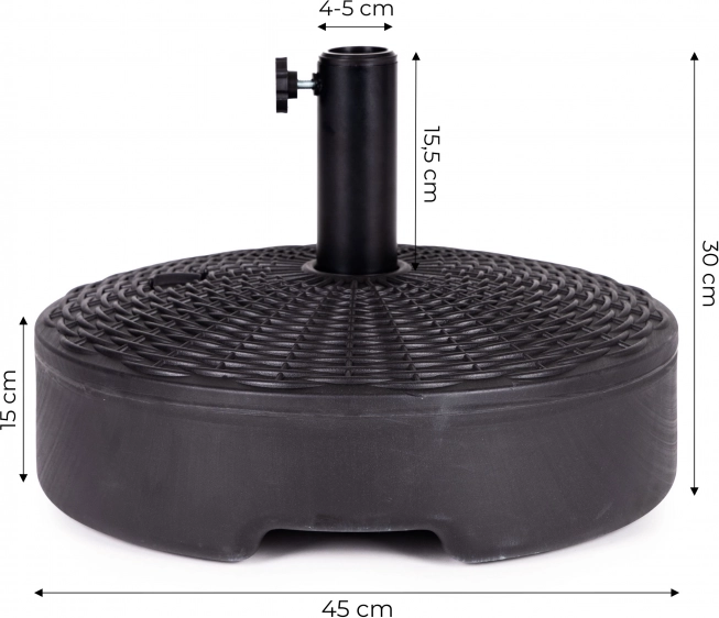 Esta base es perfecta para sombrillas más pequeñas. Fabricada en resistente material HDPE y ofrece dos opciones de diámetro para el montaje.