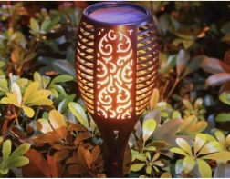 Estas lámparas solares con forma de antorcha combinan un elegante diseño calado con un efecto LED de llama natural, creando una iluminación acogedora y segura sin fuego abierto. El panel solar integrado carga la batería incorporada durante el día y las luces se encienden automáticamente al anochecer.
